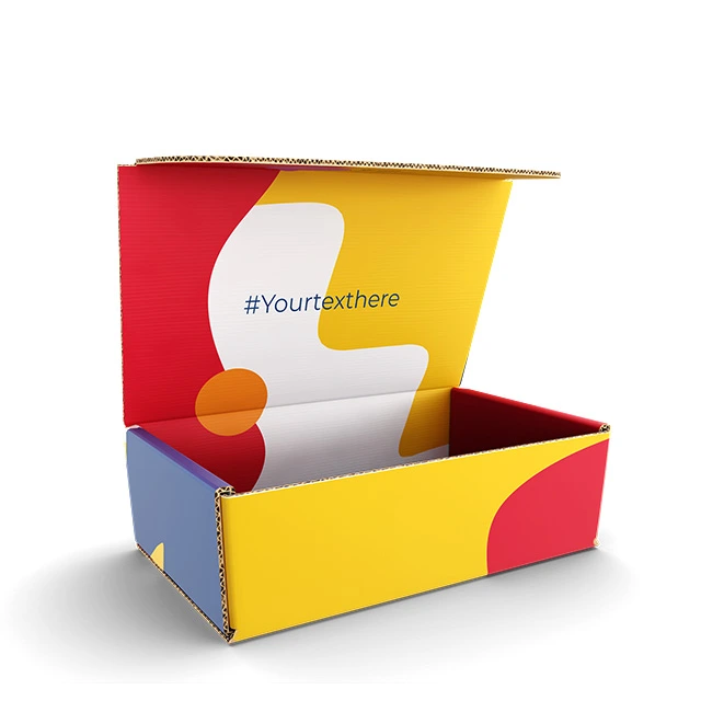 We digitally print your art on our corrugated boxes in CMYK, often referred to as 4-color process, ink with a UV cure. The UV cure ensures your art is set to withstand basic elements and won't rub off. Our printers are calibrated to SWOP standards, but no two digital printers are the same and we cannot match a PMS color. Please explore our proof options.